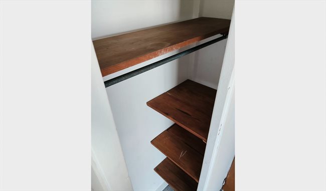 There is room enough for a queen bed, desk, bed-side table and in-built cupboard ( all included). Next to toilet and bathroom. Shares a wall with one other bedroom. Has fire-escape outside window and looks out towards the Polytech building. Comes with a pin board and lush carpeting. Rent is $180 per week ( this does not include the cost of utilities) .