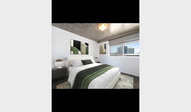Modern Room with a large built-in wardrobe, fully furnished with a queen bed and a side table & Lamp,