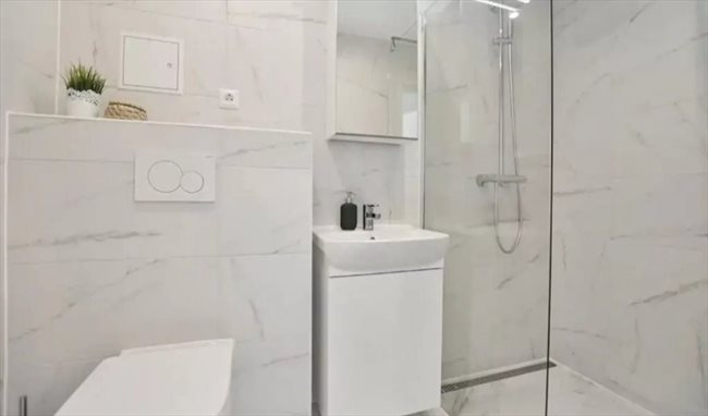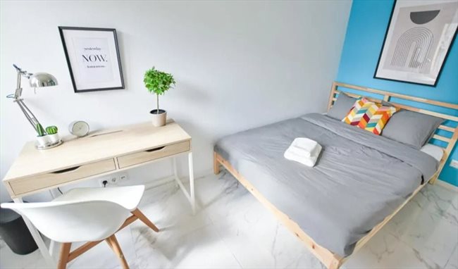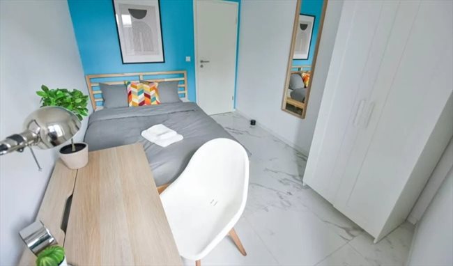 - Chambre meublée (lit double, armoire, bureau, chaise) dans un appartement moderne et entièrement équipé de 3 chambres au total. Les deux autres chambres sont occupées par deux jeunes professionnels.