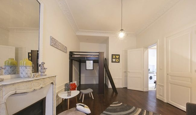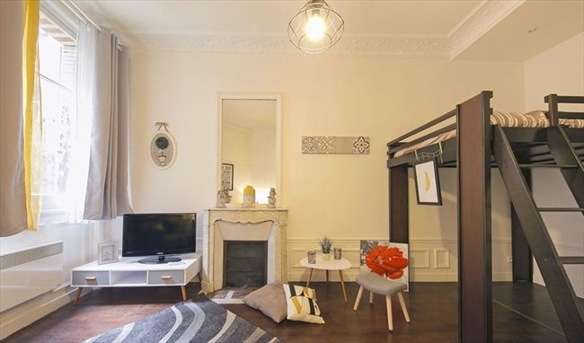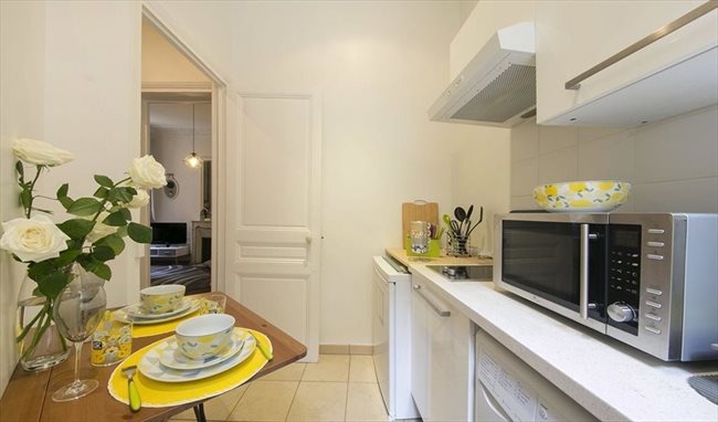 Una cocina equipada y amueblada, un sofá cama, un altillo, un baño con WC, suelos de parquet, paredes blancas, una bonita terraza.